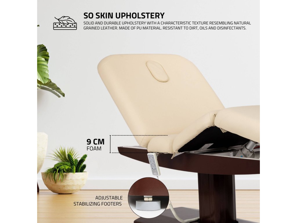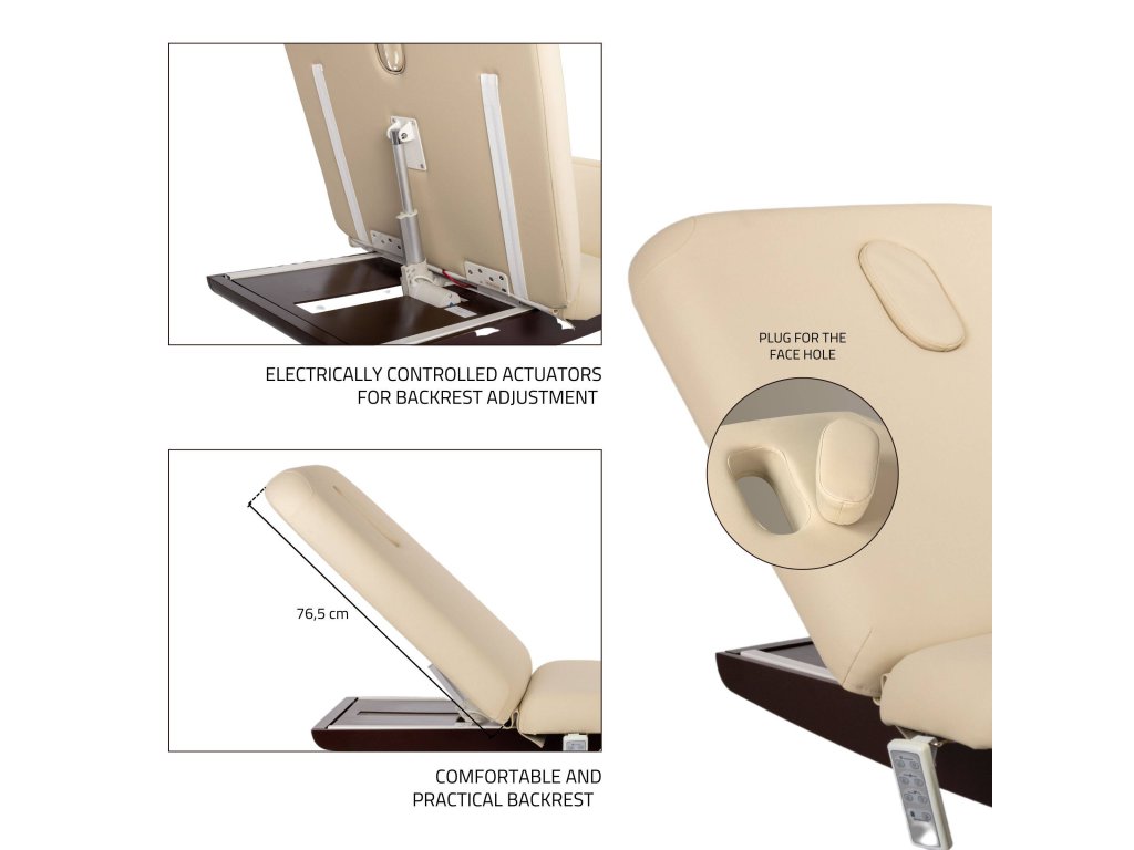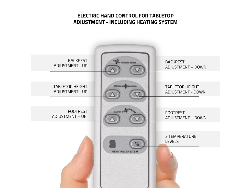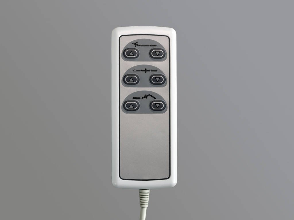 A három nagy teljesítményű elektromos motor lehetővé teszi a magasság, a fejrész és a lábtartó precíz beállítását egyetlen kézi távirányítóval.