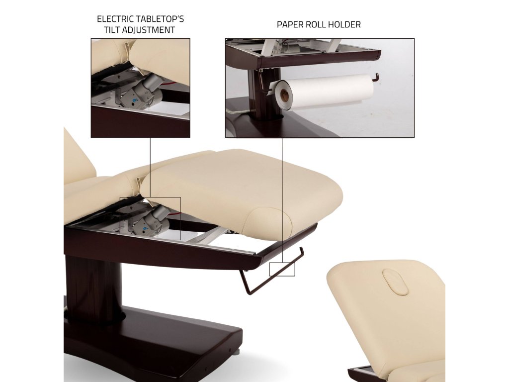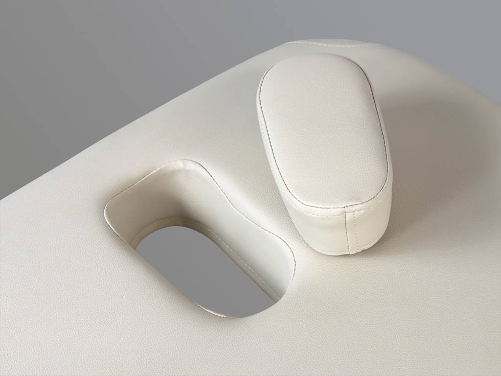 A fejtámla arckivágással és állítható dőlésszöggel (+70°) készült, így a páciens teljes relaxációban pihenhet. Az ágy emellett papírtekercs-tartóval és állítható stabilizáló lábakkal is fel van szerelve, hogy minden munkakörnyezethez rugalmasan alkalmazkodjon.