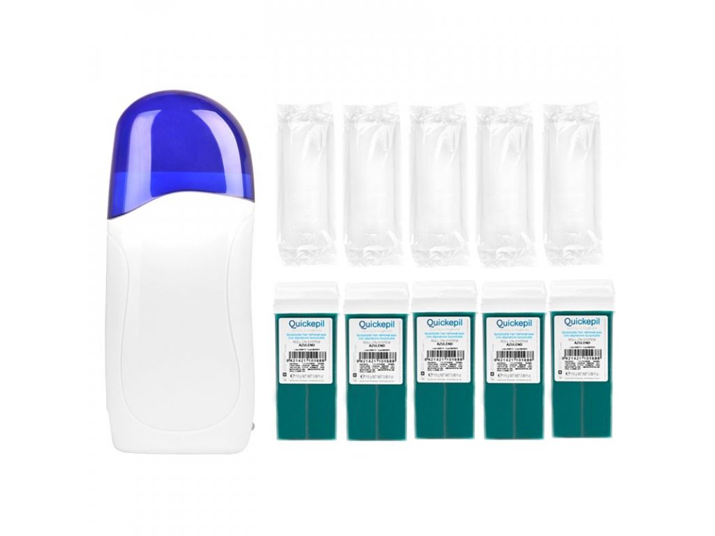A szett része egy 100 g-os QUICKEPIL azulénes roll-on viaszpatron, amely kifejezetten érzékeny bőrre lett kifejlesztve. A viasz gyorsan hűl, vékony rétegben terül, és csökkenti a kellemetlen égető érzést. A benne lévő azulén nyugtató és gyulladáscsökkentő hatású.