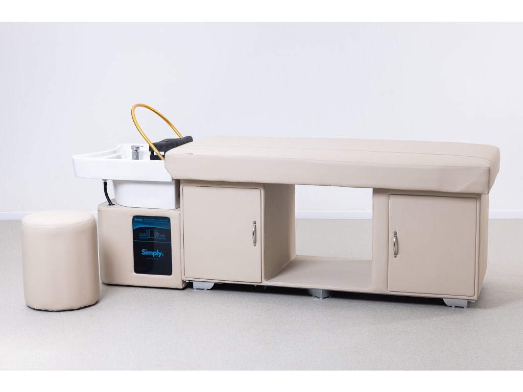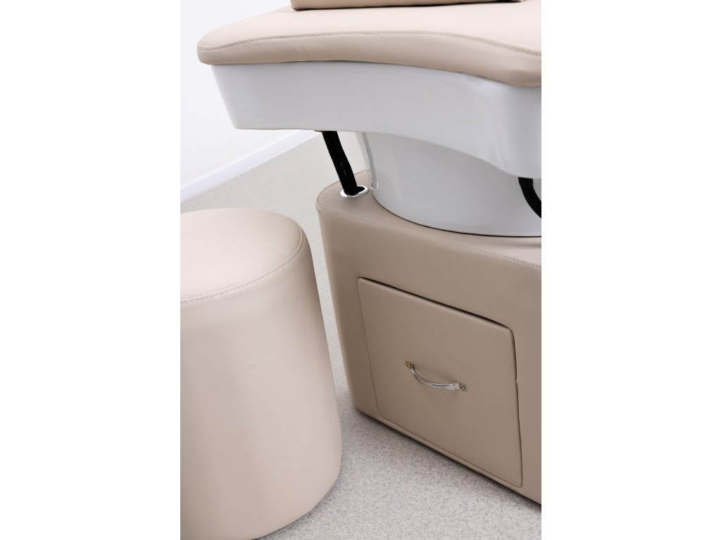 A bézs színű Head SPA kezelőágy kerámia tállal és dupla szekrénnyel a kényelem, a funkcionalitás és az esztétika tökéletes ötvözete. Ez a prémium kialakítású Head SPA nyugágy ideális választás minden modern fodrász szalon, wellness központ vagy szépségápolási szolgáltató tér számára, ahol a cél a vendégek teljes relaxációja és a professzionális fejbőr- és hajkezelések biztosítása.