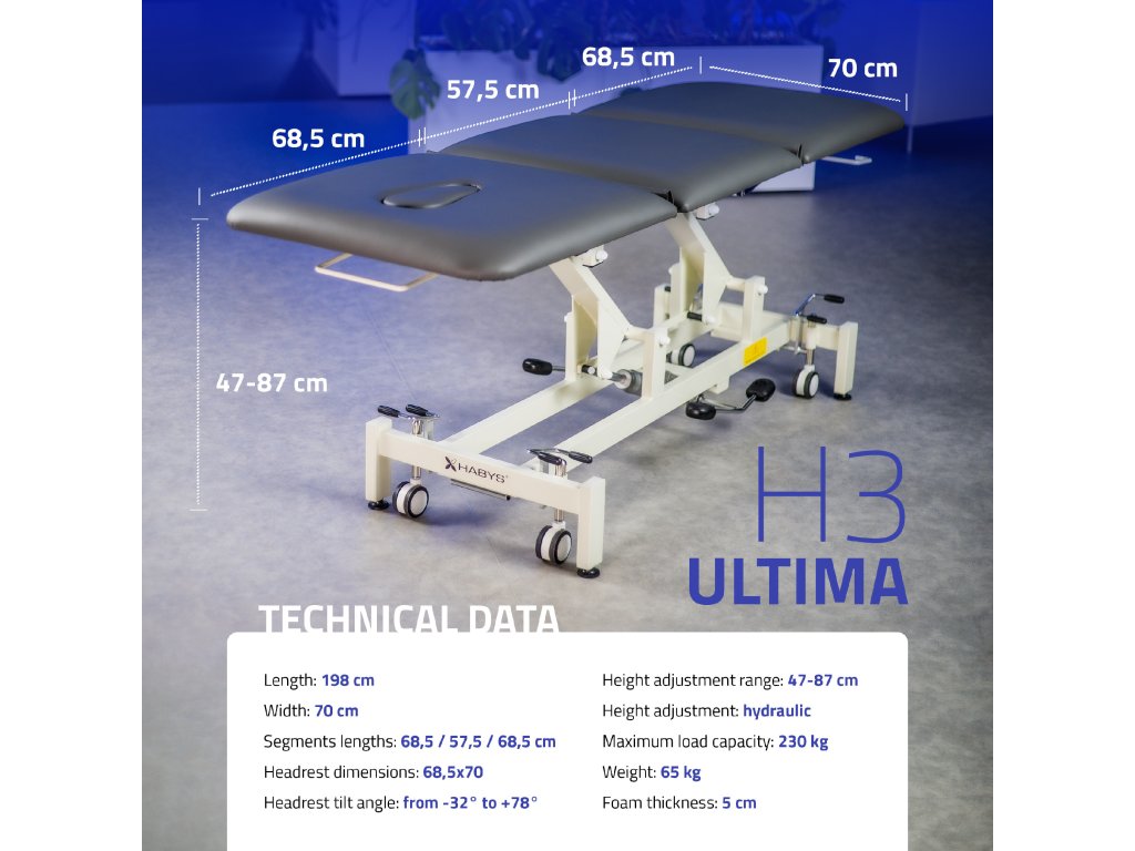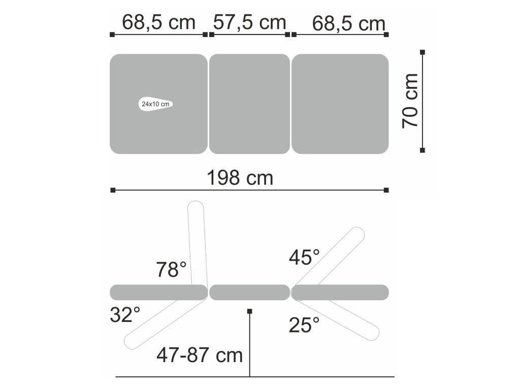 Háromrészes fekvőfelület: 198 × 70 cm – külön állítható szekciók a pontos pozicionáláshoz