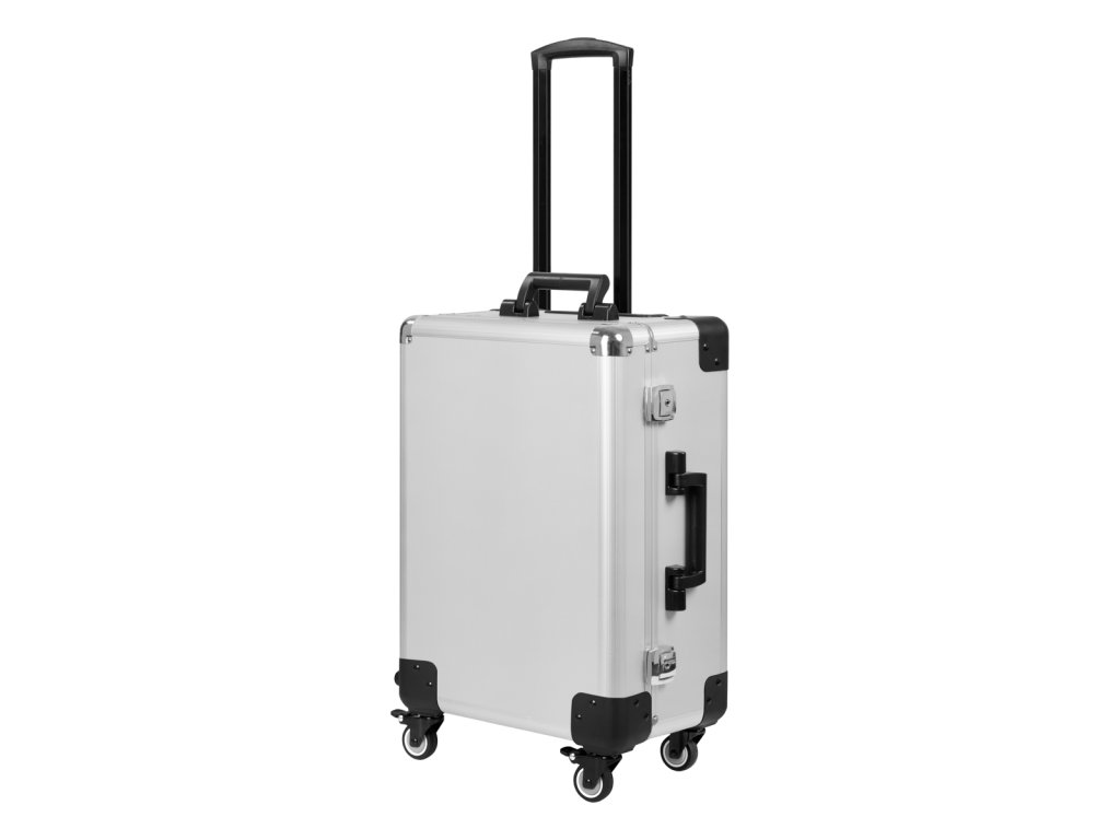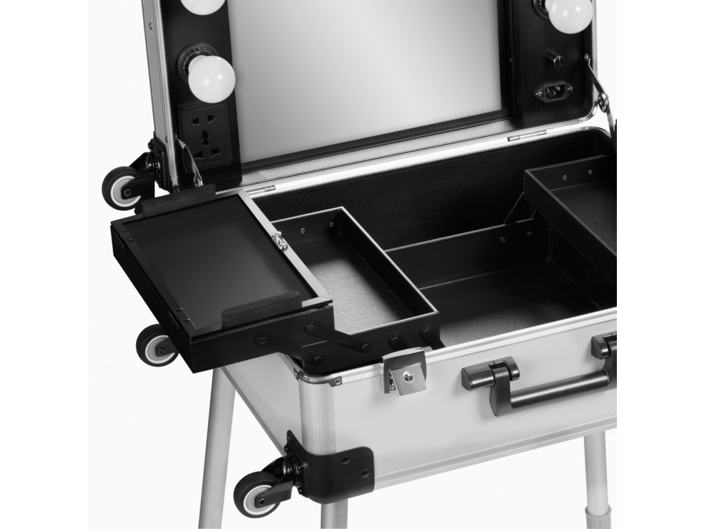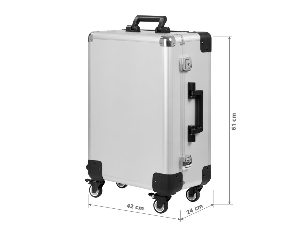 A T-27 szürke (ezüst) kozmetikai bőrönd a mobil kozmetikai munkavégzés prémium szintjét képviseli. Ez a görgős bőrönd nemcsak szállításhoz praktikus, hanem teljes értékű sminkes állomássá alakítható, köszönhetően a beépített teleszkópos lábaknak, amelyek állítható magasságot biztosítanak.