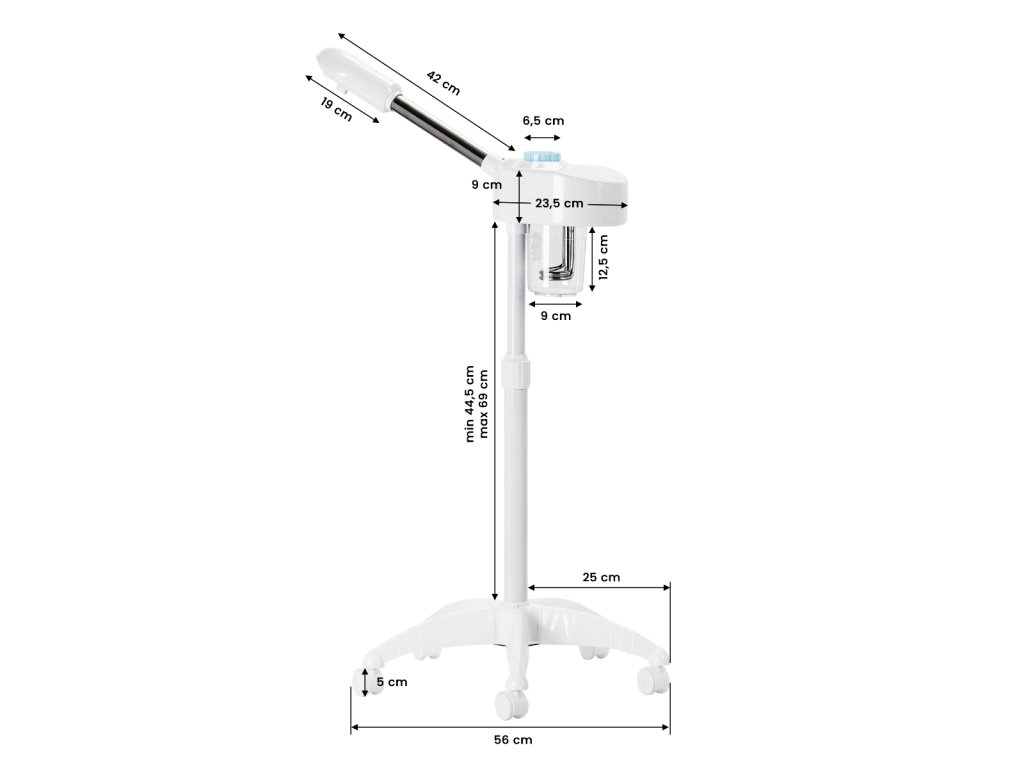 A készülék 600 ml-es tartállyal rendelkezik, amely elegendő gőzt biztosít hosszabb kezelésekhez is. A magasság állítható, így kényelmesen hozzáigazítható a különböző kezelésekhez. A stabil, négykarú gurulós talp lehetővé teszi a könnyű mozgatást a szalonon belül.