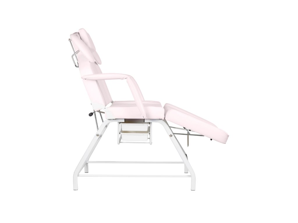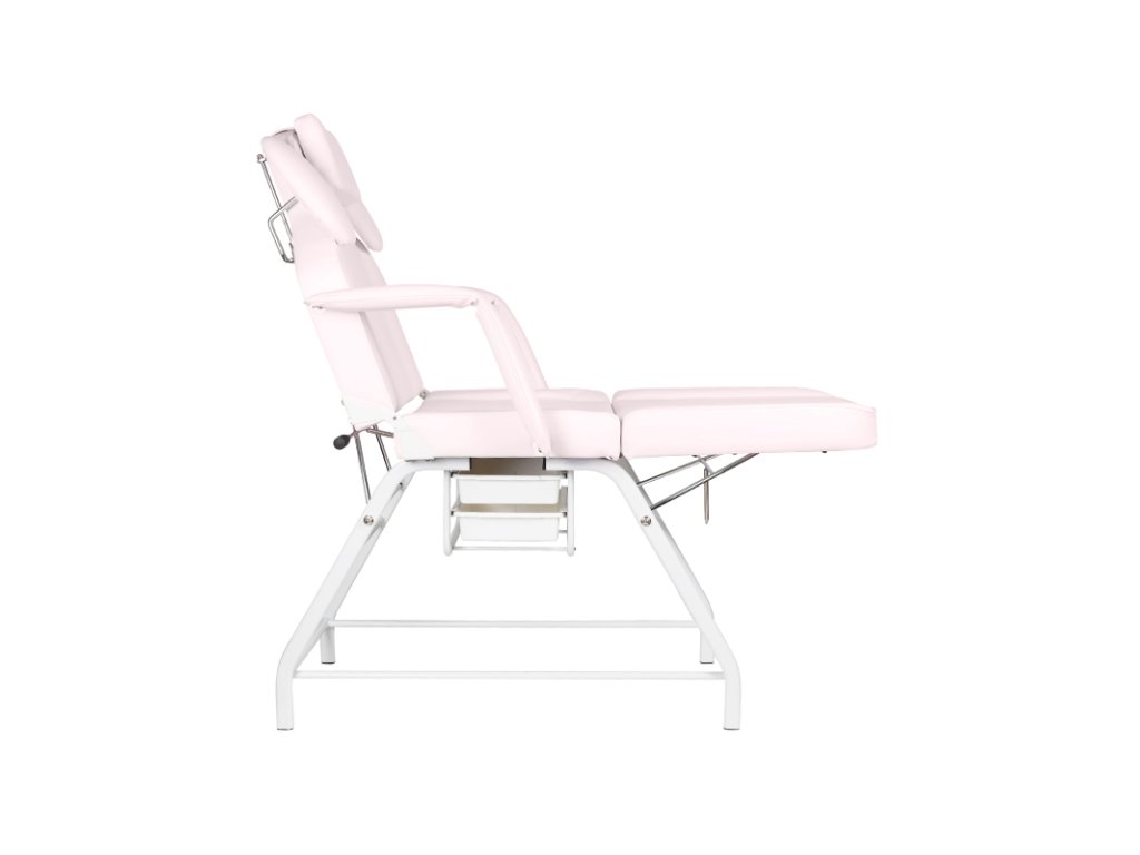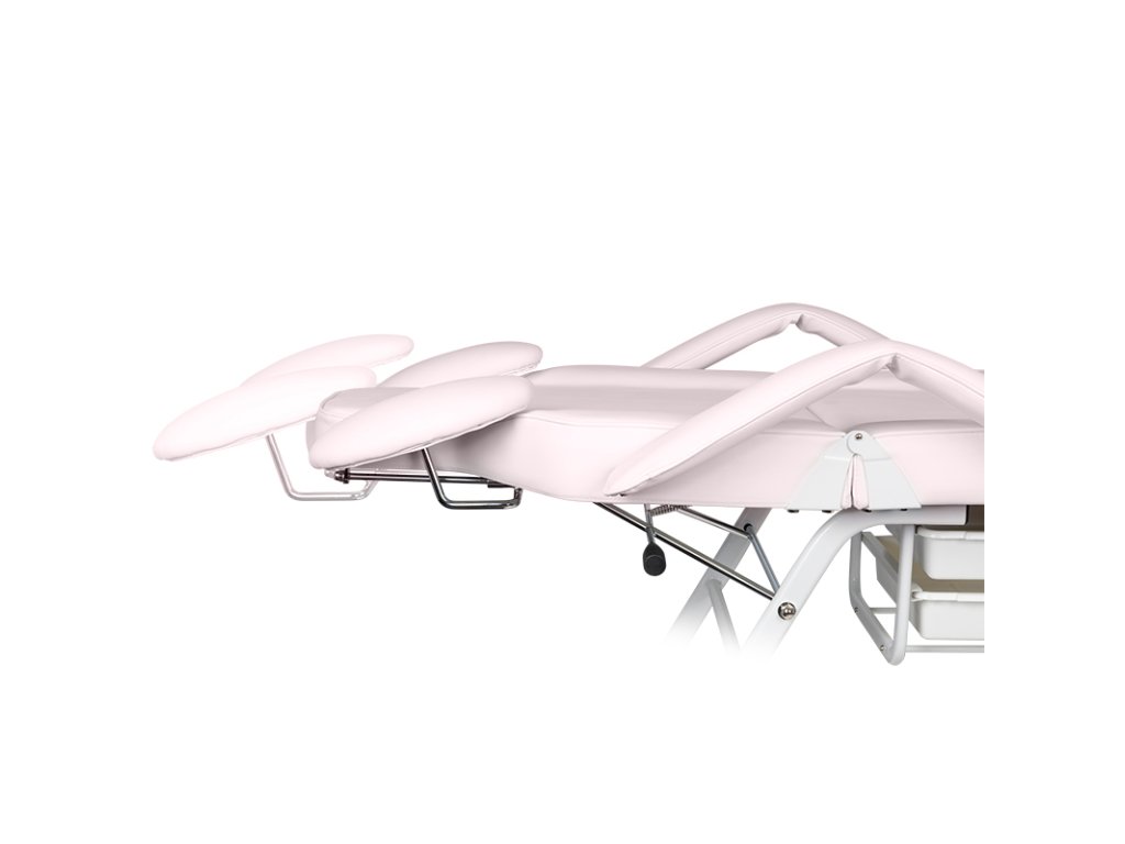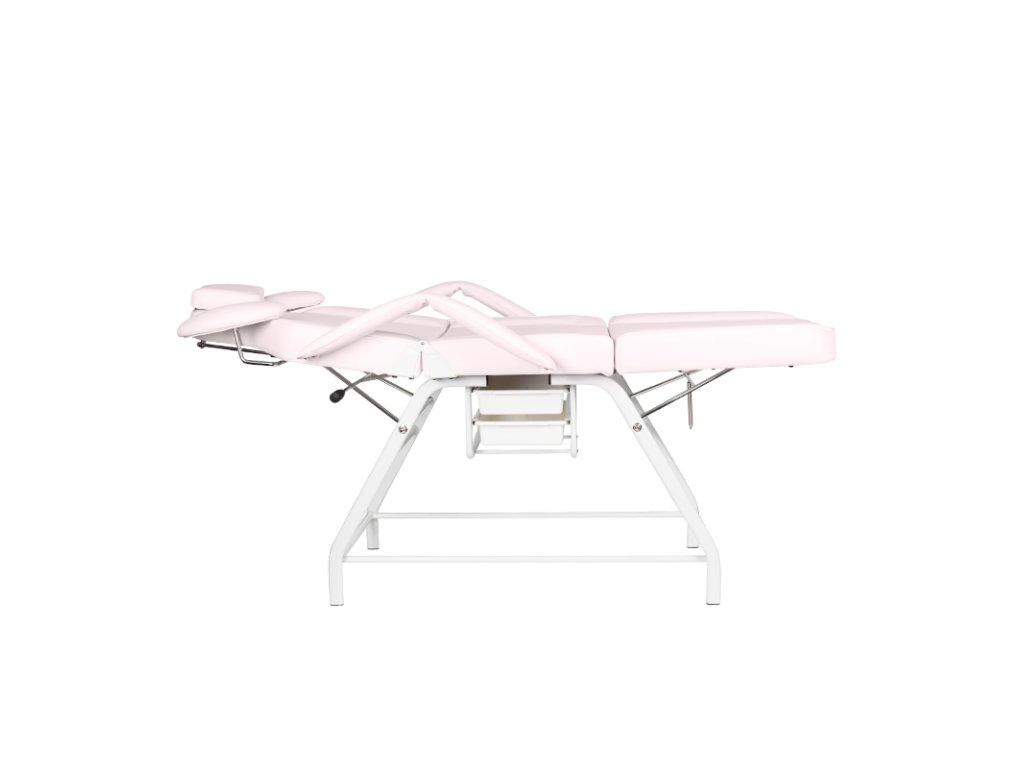 A levehető kartámaszok megkönnyítik a be- és kiszállást, míg a beépített műanyag fiókok praktikus tárolási lehetőséget kínálnak a kezelések során használt eszközök számára. Az ágy huzata rozsaszín színű, kiváló minőségű EKO műbőr, amely nemcsak esztétikus, de rendkívül könnyen tisztítható és ellenáll a kozmetikai szereknek is.