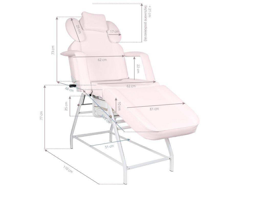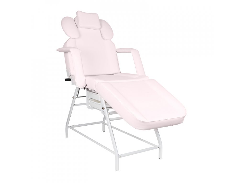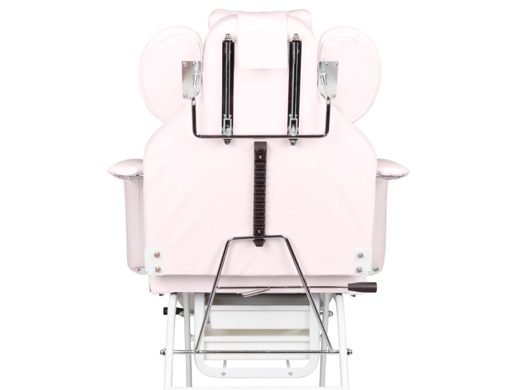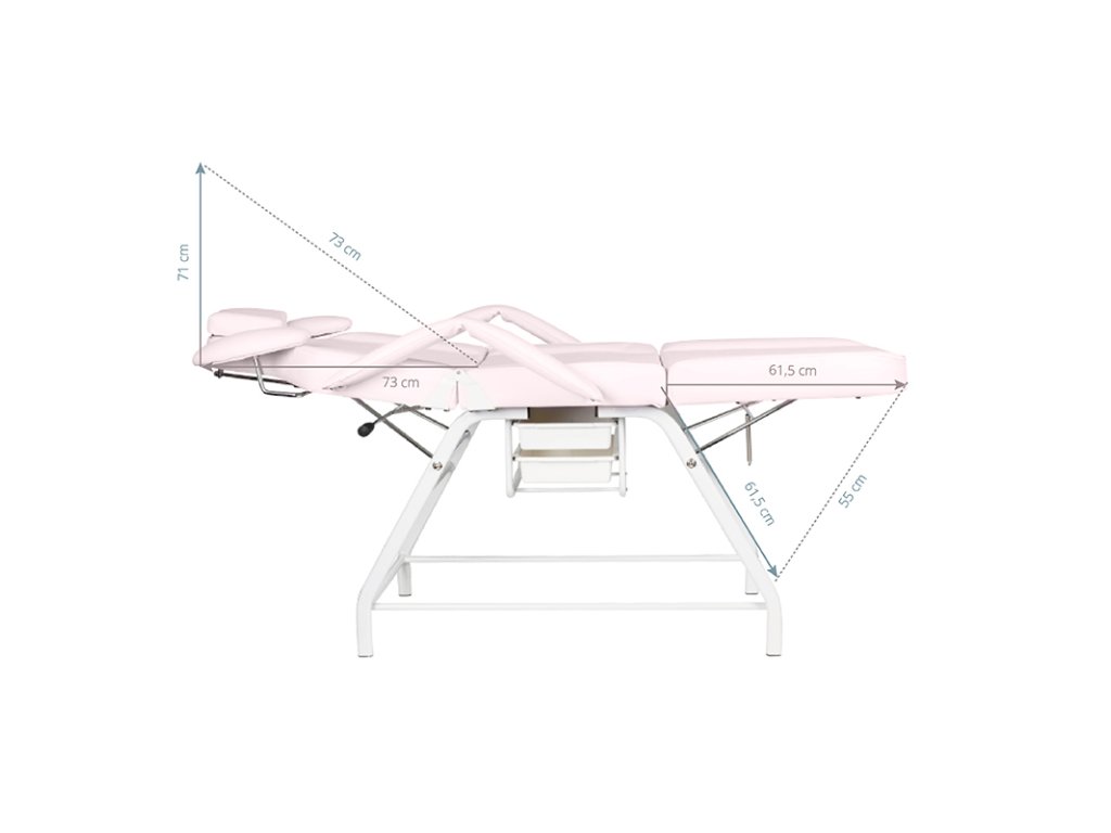 A levehető kartámaszok megkönnyítik a be- és kiszállást, míg a beépített műanyag fiókok praktikus tárolási lehetőséget kínálnak a kezelések során használt eszközök számára. Az ágy huzata rozsaszín színű, kiváló minőségű EKO műbőr, amely nemcsak esztétikus, de rendkívül könnyen tisztítható és ellenáll a kozmetikai szereknek is.