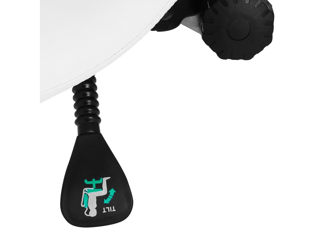 Az ötgerendás, jól megtervezett, arany árnyalatú talapzatnak köszönhetően a zsámoly még intenzív munkavégzés esetén is stabil. A görgők jelentős mobilitást biztosítanak , így a bútor könnyen mozgatható az irodában. A tartós zsámoly kárpitozása fehér árnyalatú műbőrből készült. Az ilyen anyag használatának köszönhetően a zsámoly ellenáll a nedvességnek és könnyen tisztítható.
