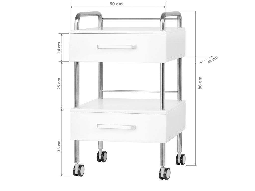A kocsi két fiókkal van felszerelve, melyek tökéletesek szerszámok, eszközök és kiegészítők biztonságos és rendezetten történő tárolására. Emellett rendelkezik egy nyitott tárolópolccal, amely kiválóan alkalmas egy lábvágó készülék vagy más gyakran használt berendezések elhelyezésére.