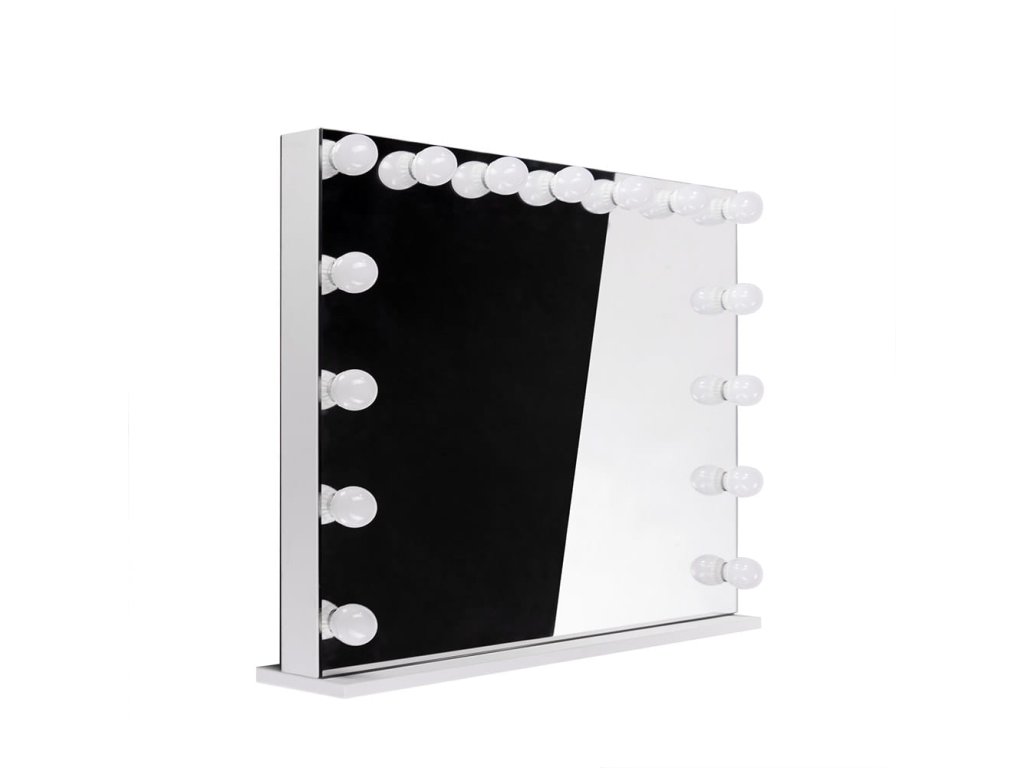 Moderní zrcadlo HOLLYWOOD s LED osvětlením 120x80 cm z vysoce kvalitního skla. Hrany jsou broušené a leštěné. Ideální jako kosmetické zrcadlo, zrcadlo v koupelně nebo v šatně!- Vypínač světla na potenciometru. - 15 LED bodů (výška od zrcadla 5 cm). - Má funkci stmívače. Proměnná na potenciometru. - Životnost osvětlení LED až 25 000 pracovních hodin. - Zrcadlo má praktickou základnu o rozměrech 120x15 cm, lze jej také připevnit na zeď. Hloubka rámu 44 mm. - Má zásuvku USB pro nabíjení telefonu / tabletu. Rozměry balení: 130x95x17cm, hmotnost v balení 17kg.