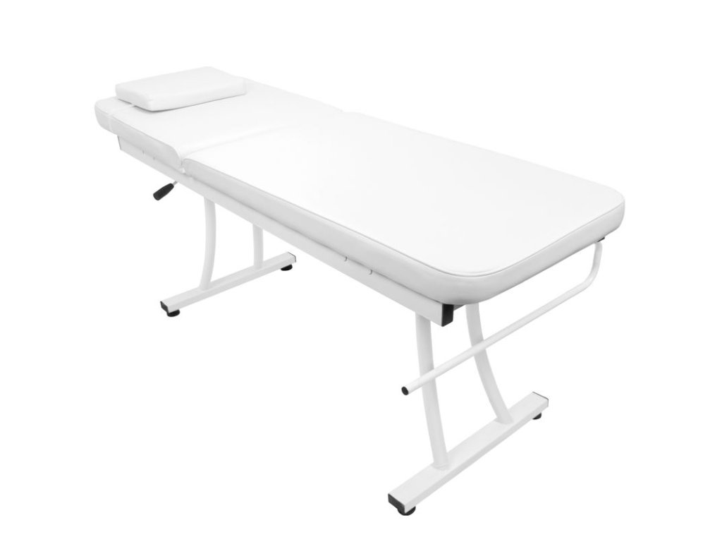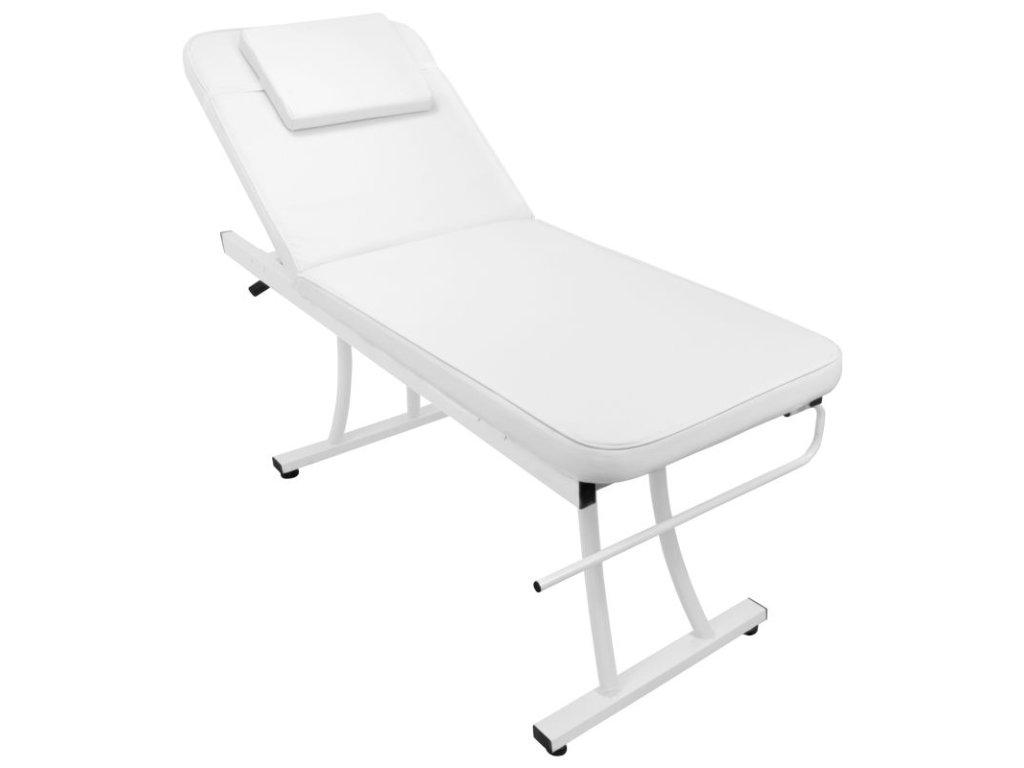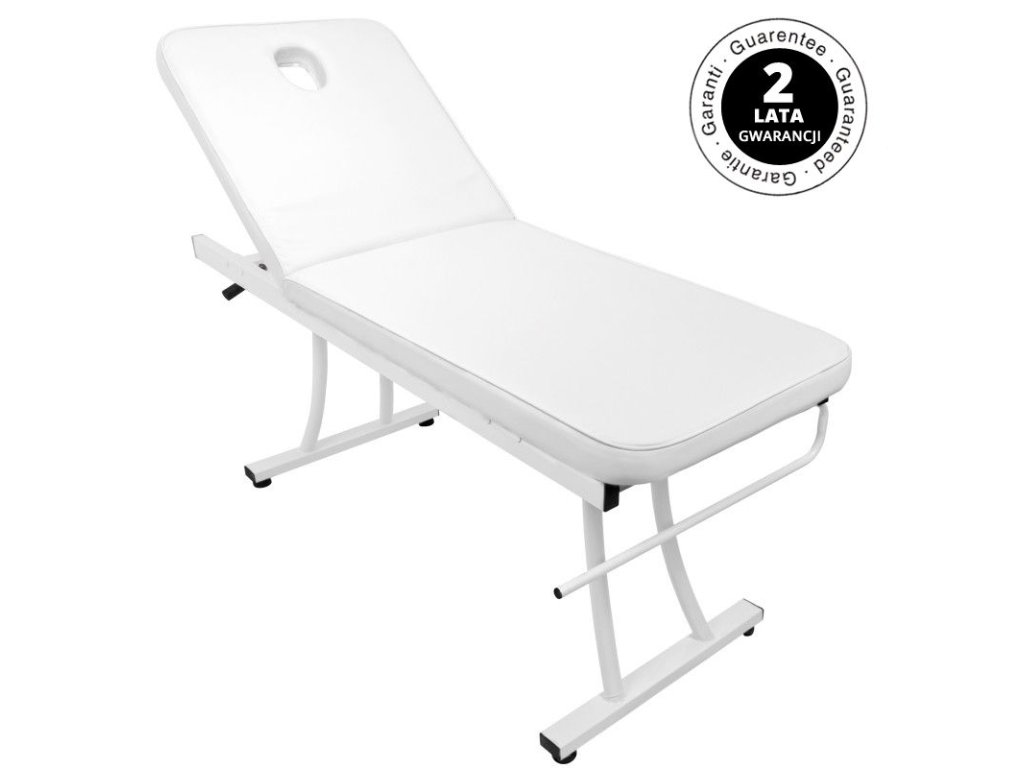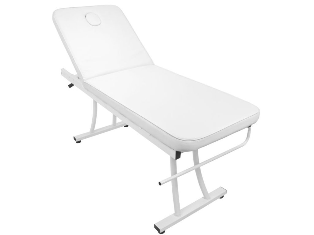 A stabil és megbízható szerkezet 150 kg maximális terhelhetőséggel rendelkezik, így biztonságos használatot biztosít minden vendég számára. A fekvőfelület fehér PVC kárpitozással van bevonva, amely könnyen tisztítható, fertőtleníthető, és higiénikus környezetet garantál még intenzív használat mellett is.
