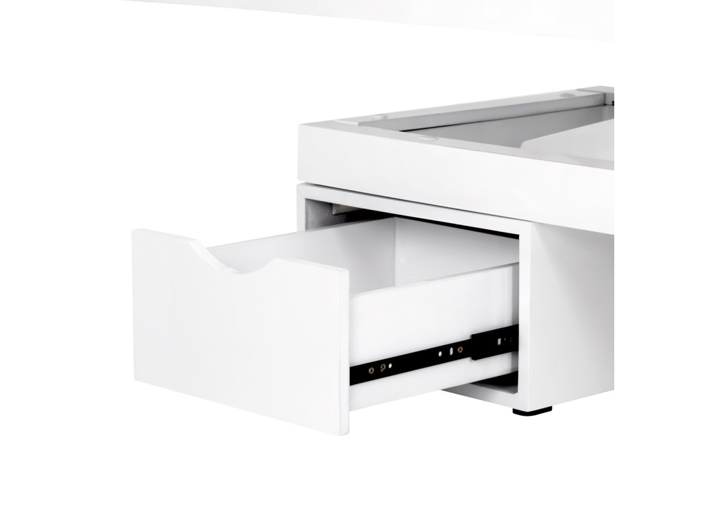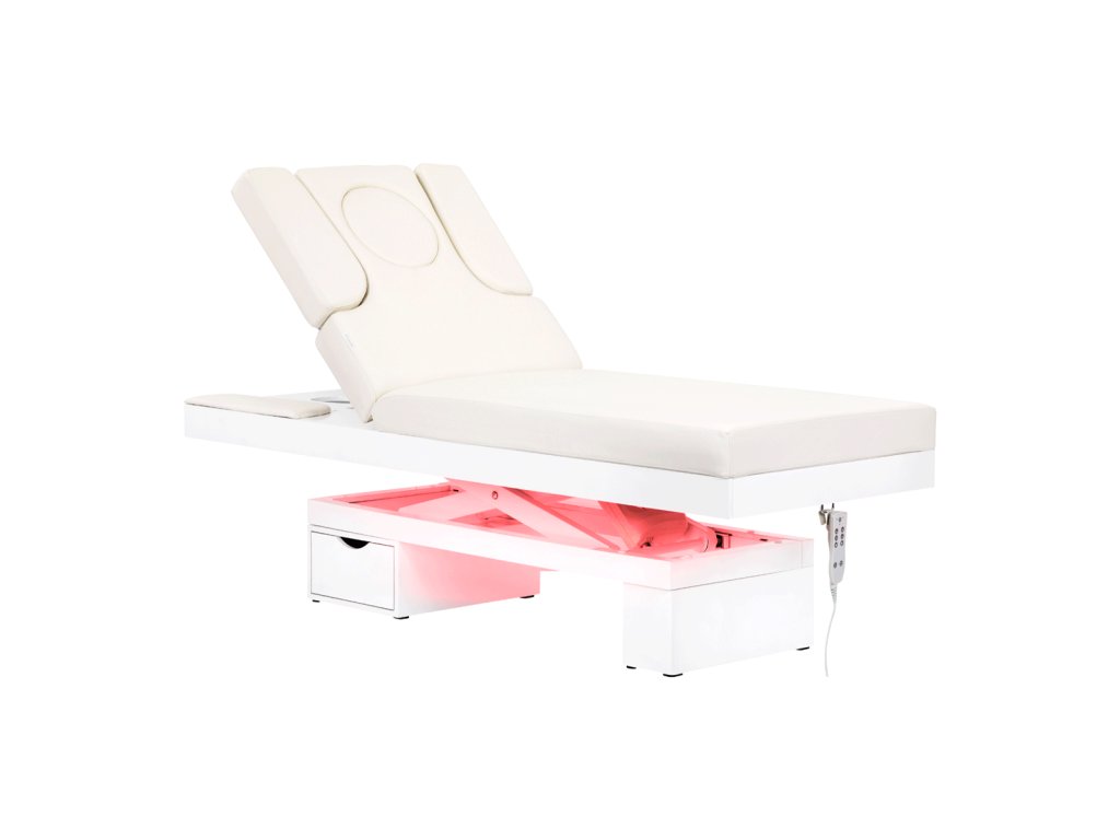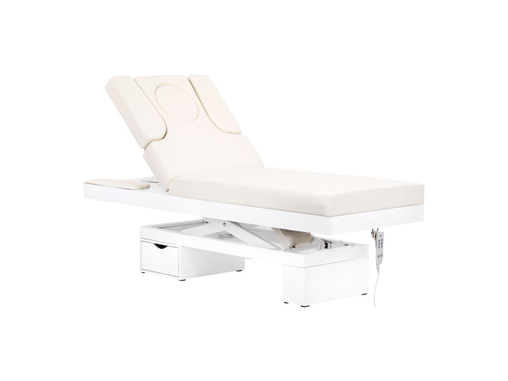 Az ágy háttámlája oldalirányban meghosszabbítható vagy akár teljesen eltávolítható, így különböző típusú kezelésekhez is ideális. A háttámla alatt található egy praktikus tárolófiók, amely lehetővé teszi a kozmetikai eszközök diszkrét és kényelmes tárolását a kezelések során.