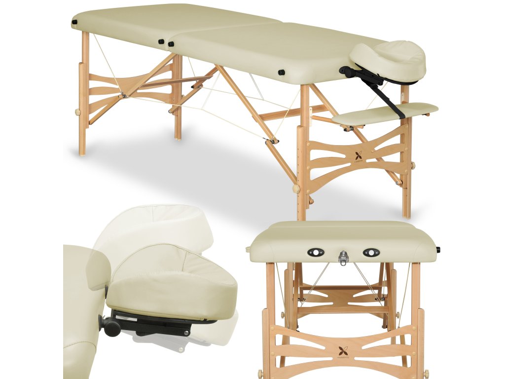 A komfortos 5 cm-es habszivacs, az ergonómiailag lekerekített sarkok, valamint a 2D ERGO arctámasz minden vendég számára kényelmes kezelést tesznek lehetővé. A tartós, furnérozott rétegelt lemez harmonizál a fa lábszerkezettel, biztosítva a stílusos és egységes megjelenést.