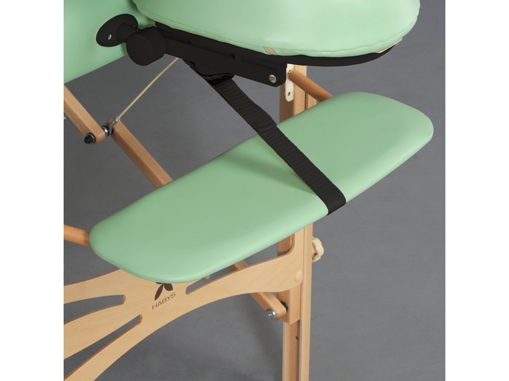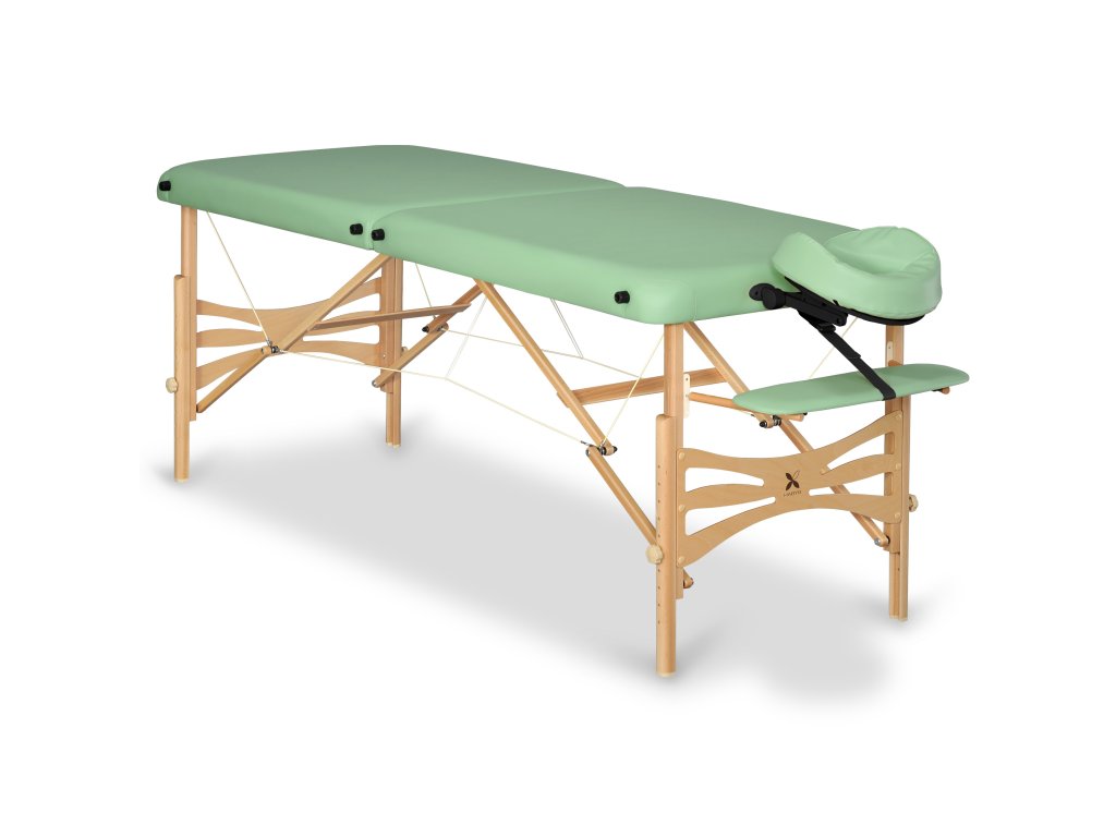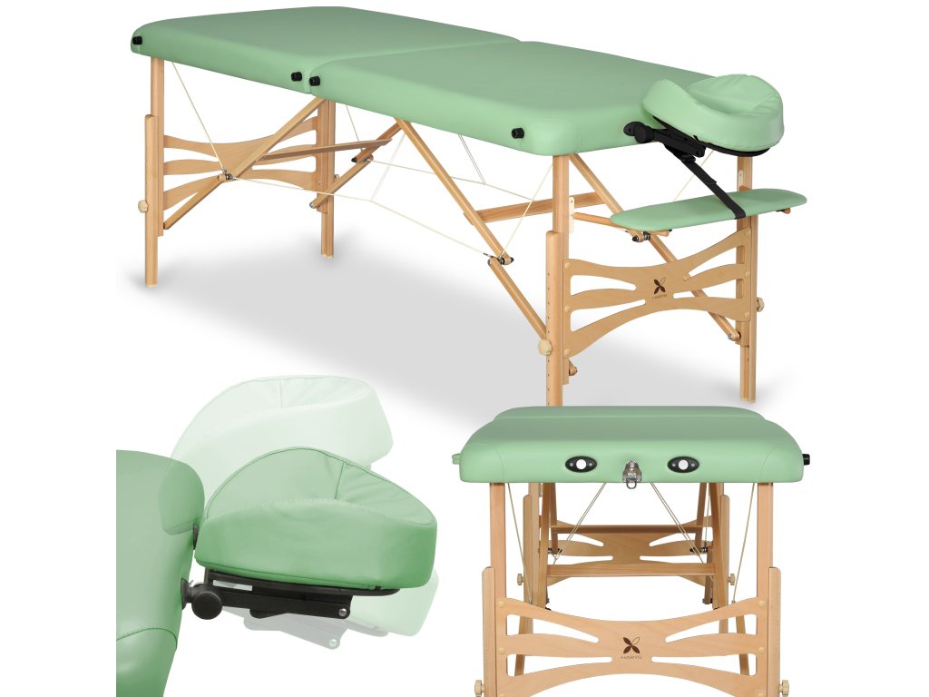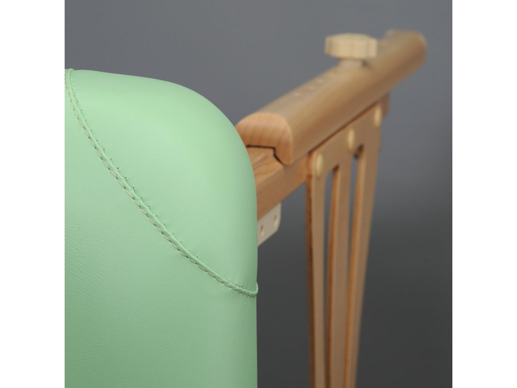 A kényelmet a 5 cm vastag komfort habszivacs, az ergonómikusan lekerekített sarkok, valamint a 2D ERGO arctámasz biztosítják. A tartós furnérozott rétegelt lemez harmonizál a fa szerkezettel, a zöld színű Vinyl Flex kárpitozás pedig friss, természetes megjelenést ad a kezelőágynak.