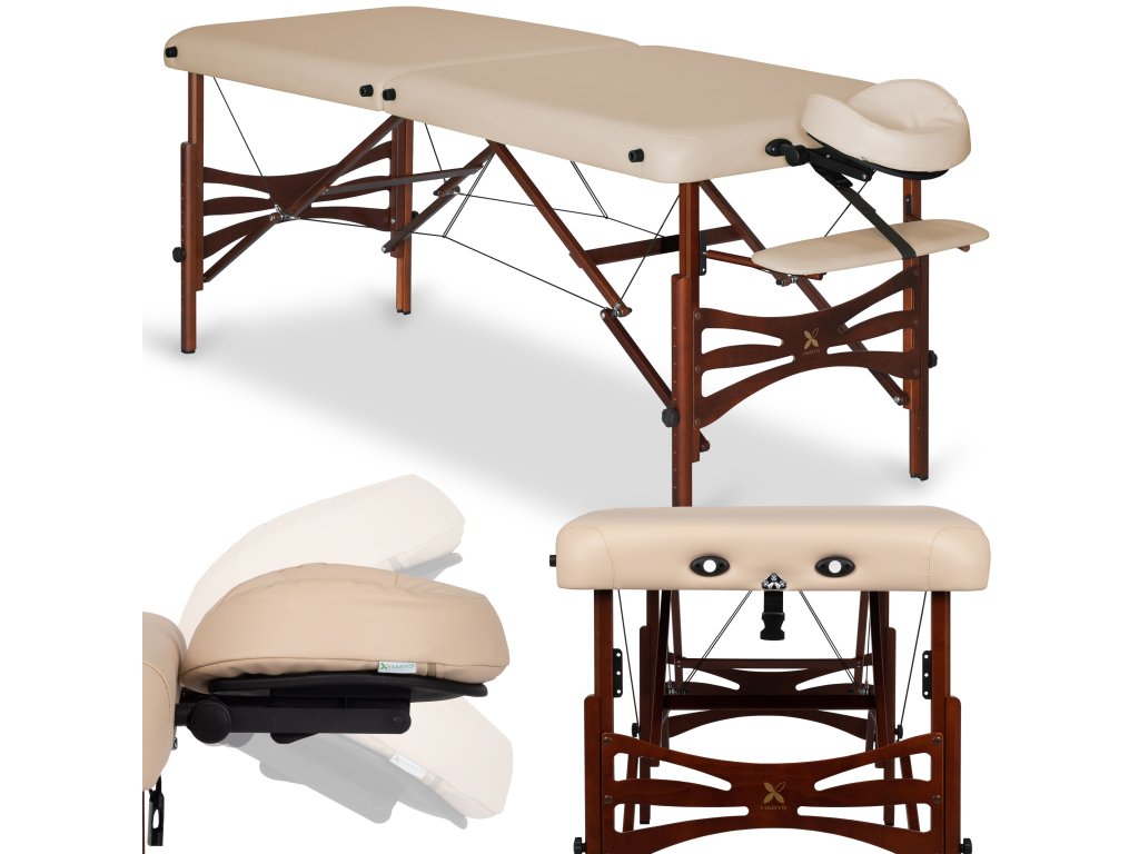 A masszív, csúszásmentes gumi lábakkal és robusztus rozsdamentes acél zsanérokkal felszerelt szerkezet hosszú távú stabilitást és biztonságot kínál. Az ergonomikusan lekerekített asztalsarkok növelik a vendég komfortérzetét, míg a 5 cm vastag komfort hab és a 2D ERGO arctámasz maximális kényelmet biztosítanak a kezelés során.