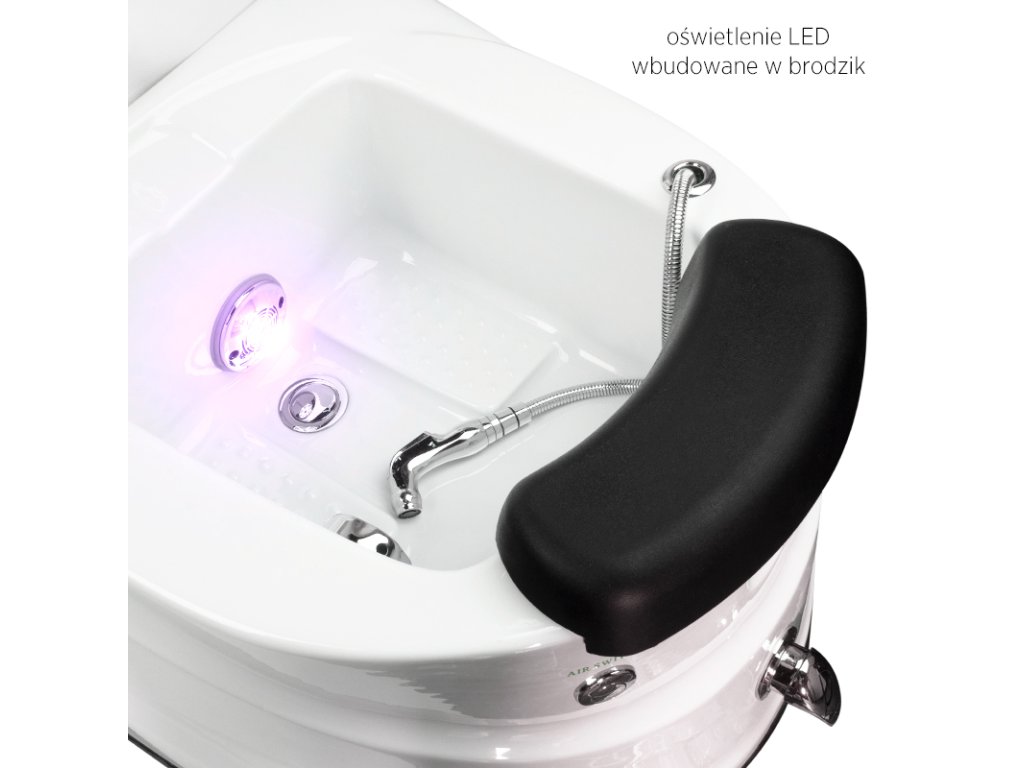 A szék tartalmaz egy állítható lábtartóval felszerelt pedikűrtálcát, amely maximális rugalmasságot biztosít a szakembernek. Emellett az ülés egy beépített vízelvezető szivattyúval is rendelkezik, amely megkönnyíti a víz eltávolítását a pedikűrtálcából, ezzel is egyszerűsítve a használatot és a tisztítást.