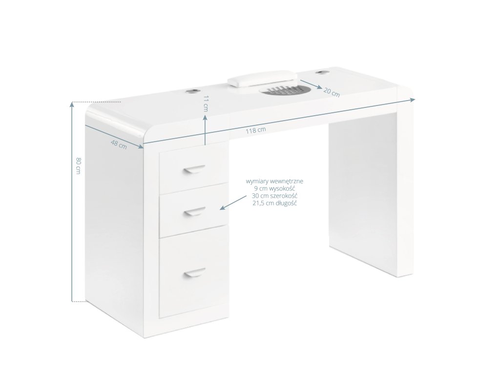 A műkörmös asztal három funkciót egyesít: munkaasztalként, hatékony porelszívóként és tárolóegységként szolgál. A beépített kábelkivezetők megakadályozzák a zavaró vezetékek felhalmozódását, így a munkavégzés átlátható és professzionális marad. A tágas fiókok és szekrények lehetővé teszik a gépek, eszközök és lakkok kényelmes elhelyezését.