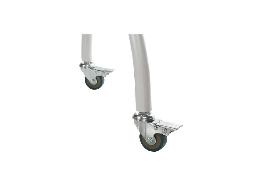 A stabil alumínium váz és a fehér laminált munkafelület tartós, mégis elegáns kialakítást biztosítanak. Az asztal könnyen tisztítható nedves ruhával, így a higiénia fenntartása is egyszerű. A zárral rögzíthető kerekek lehetővé teszik az asztal gyors pozicionálását és biztonságos rögzítését a használat során.