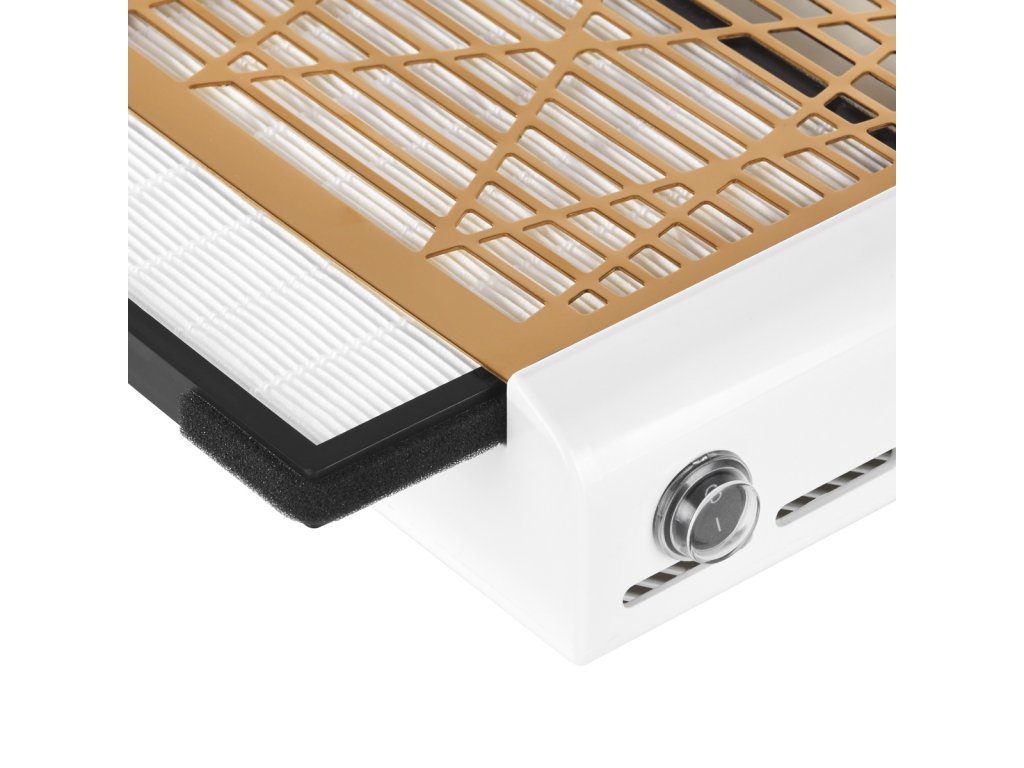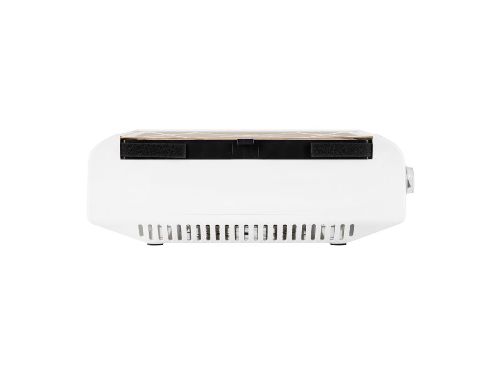A 40 W teljesítményű ventilátor hatékonyan szívja el a körömreszelés és modellezés során keletkező port. A por egy cserélhető szűrőbetétbe kerül, amely megakadályozza annak visszajutását a levegőbe, ezáltal óvva az Ön és ügyfelei egészségét. A légáramlást biztosító alsó szellőzőnyílások és a csúszásmentes lábak gondoskodnak a zavartalan, stabil és biztonságos működésről.
