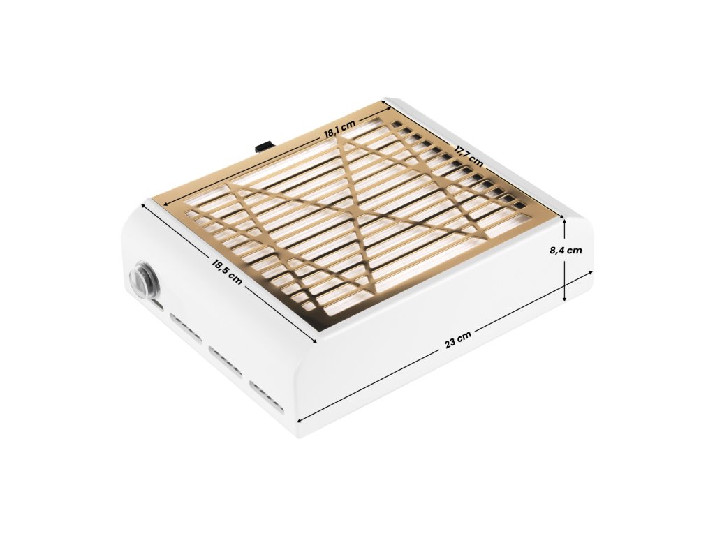 A Momo J-23 Gold műkörmös porelszívó prémium választás minden professzionális manikűr- és pedikűrszalon számára, ahol fontos a pormentes, higiénikus munkakörnyezet és az elegáns megjelenés. A kompakt, fehér burkolattal és aranyszínű ráccsal ellátott készülék nemcsak funkcionálisan kiváló, hanem esztétikailag is emeli a szalon színvonalát.
