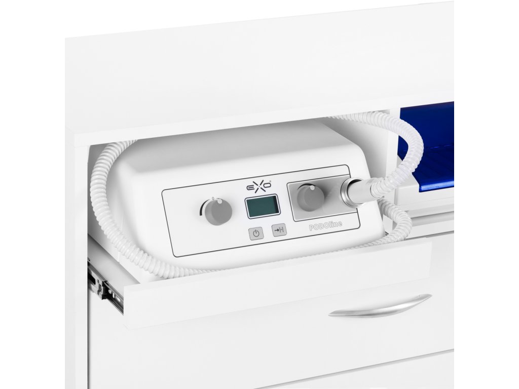 A beépített Exo Podo Line marógép elszívó rendszerrel rendelkezik, mely akár 30 000 fordulat/perc sebességgel képes működni, miközben hatékonyan távolítja el a keratinizált bőrréteget, garantálva a tiszta munkakörnyezetet. A készülék digitális kijelzője tájékoztatást nyújt a beállításokról és a szűrő állapotáról.