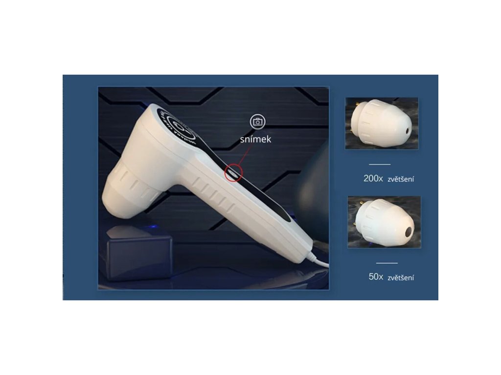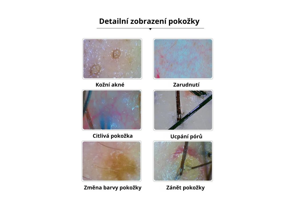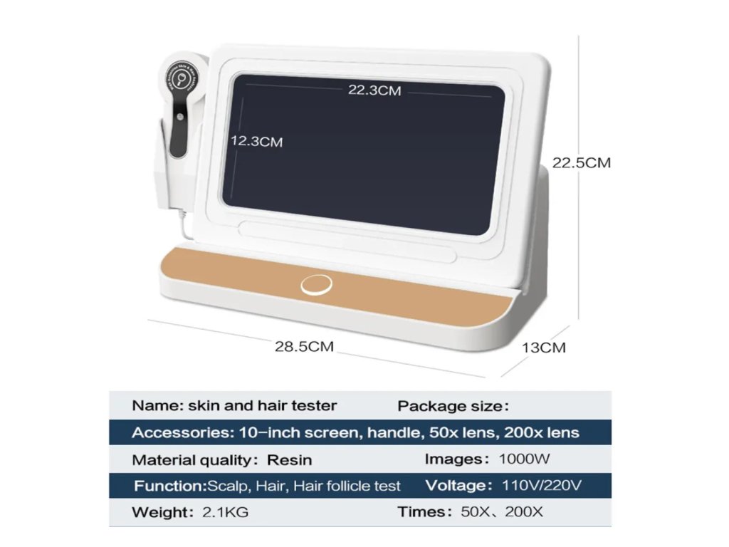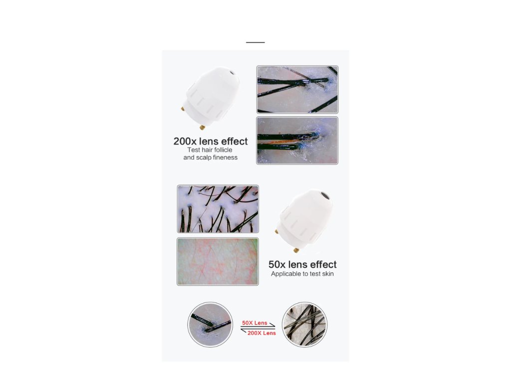 A nagy felbontású kamera és a 10 hüvelykes HD LCD kijelző valós időben mutatja a hajhagymák, fejbőr és bőrproblémák állapotát. A 50X és 200X nagyítású lencsék segítségével pontosan azonosíthatók a hajhullás, eltömődött tüszők, szárazság, pórusproblémák, pigmentációs elváltozások, vagy más fejbőrproblémák.