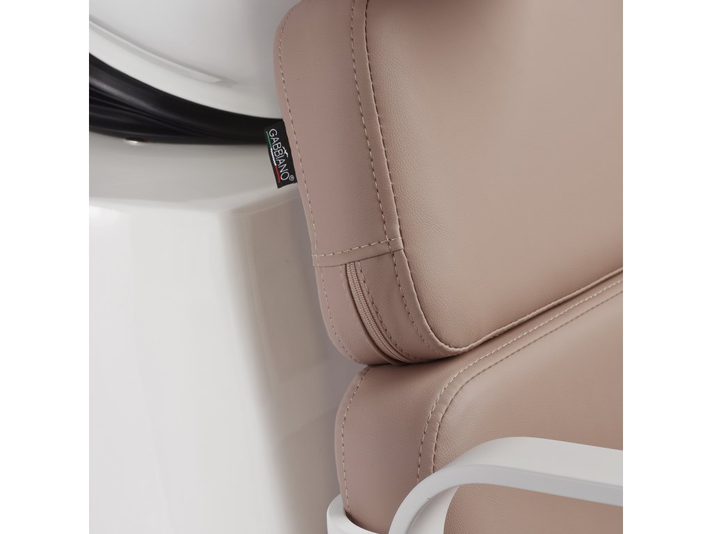 A bézs szintetikus bőrkárpitozás kellemes tapintású, könnyen tisztítható és kopásálló. A masszív, sűrű habszivacs töltet hosszú élettartamot és maximális kényelmet kínál még intenzív használat esetén is. A fekete fém kartámaszok megfelelő támaszt nyújtanak a vendégnek, növelve a kezelések alatti komfortérzetet.