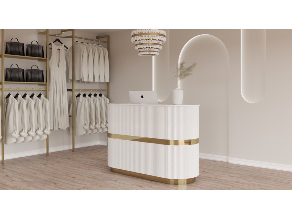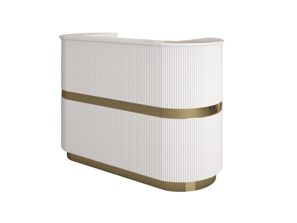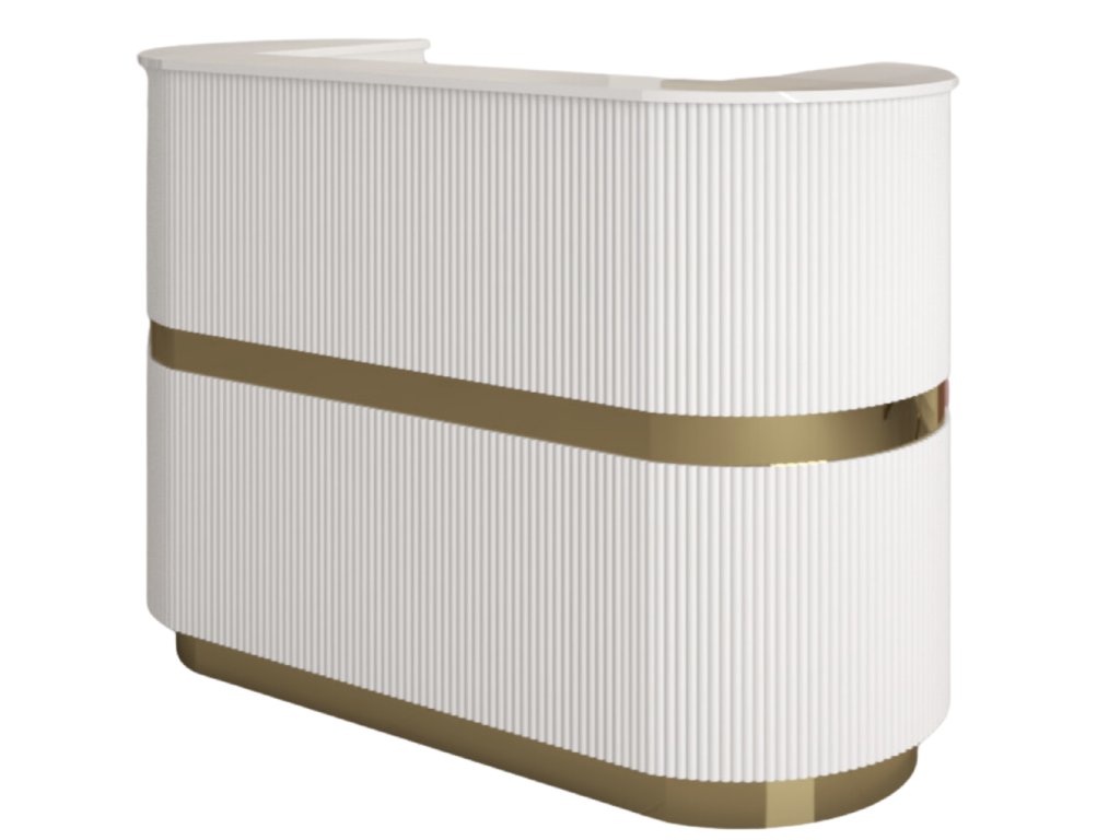 Ez a lakkozott felületű recepciós pult lekerekített oldalakkal, függőleges lécezéssel és arany színű díszítőcsíkokkal rendelkezik, amelyek kifinomult megjelenést kölcsönöznek a bútornak. Az arany színű keretek és talapzat tovább fokozzák az exkluzív hatást. A LED világítással ellátott lábazat pedig diszkrét, mégis látványos fényt biztosít a pult környezetének kiemeléséhez.