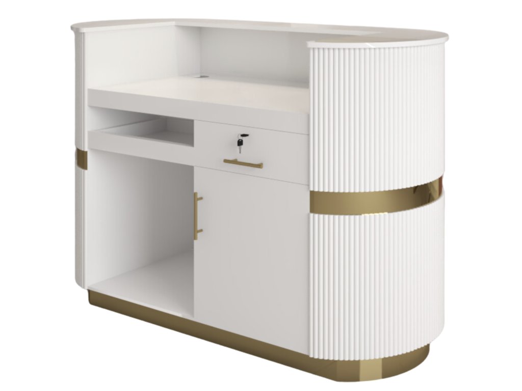 A LADA recepciós pult arany csíkokkal a modern elegancia és a funkcionalitás tökéletes kombinációja. Újdonság kínálatunkban, amely minden szalon, üzlet, SPA vagy iroda figyelemreméltó és stílusos eleme lehet.