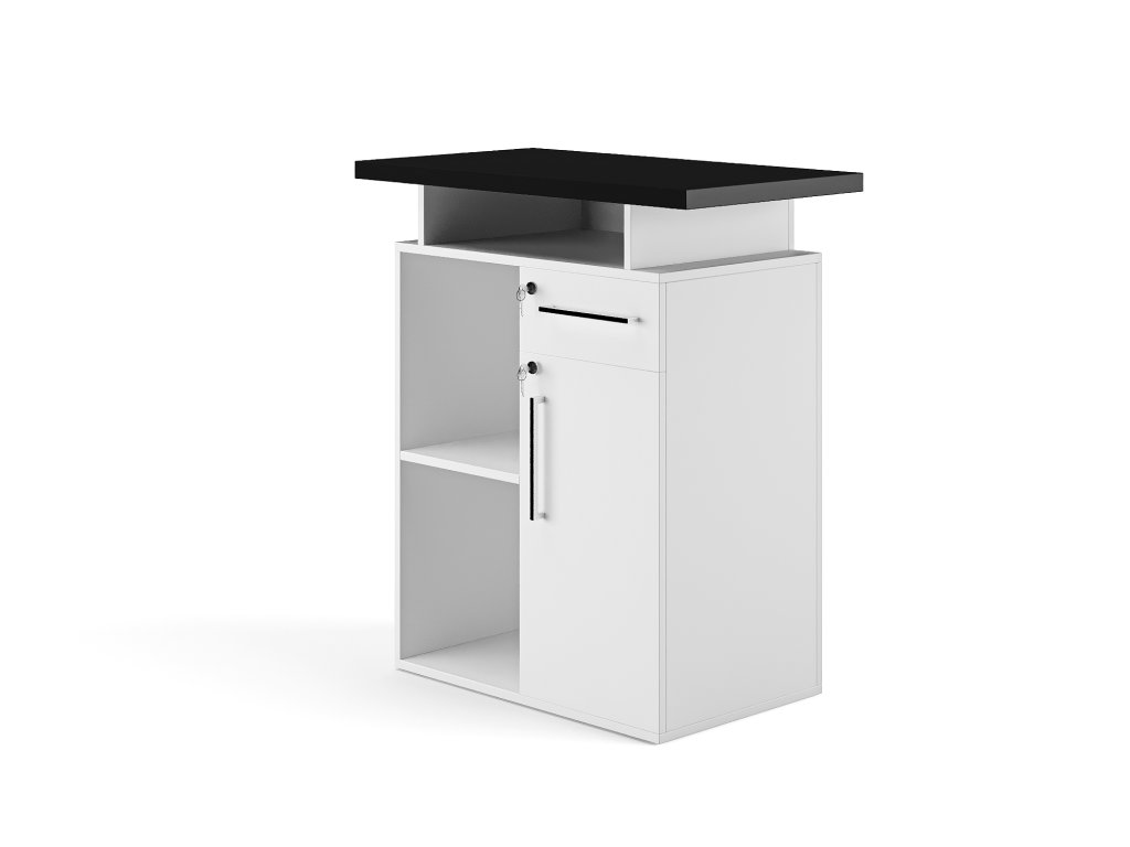 Ez a modell ideális választás olyan helyiségekbe, ahol fontos a tér maximális kihasználása – legyen szó kozmetikai szalonról, irodáról, egészségügyi rendelőről vagy más üzleti környezetről. Kis mérete ellenére teljes értékű recepciós munkaállomást biztosít.