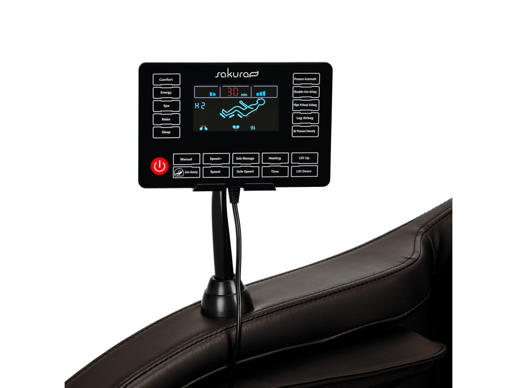 Az áttekinthető kezelőpanelnek köszönhetően - amely a jobb kartámaszra szerelt fogantyúra helyezhető vagy kézben tartható - a szék használata egyszerű és kellemes. A készülék működését az átlátszó LCD kijelzőn követheti nyomon. Jól láthatóan jelennek meg a test azon területei, amelyeken éppen a masszázst végzik, annak intenzitása, a kezelés időtartama és a kiválasztott program. A panelen szabadon módosítható a szék és a masszázsfunkciók beállítása, valamint beállítható a kezelés időtartama, amely 5, 10, 15, 20, 25 vagy 30 percig tarthat.