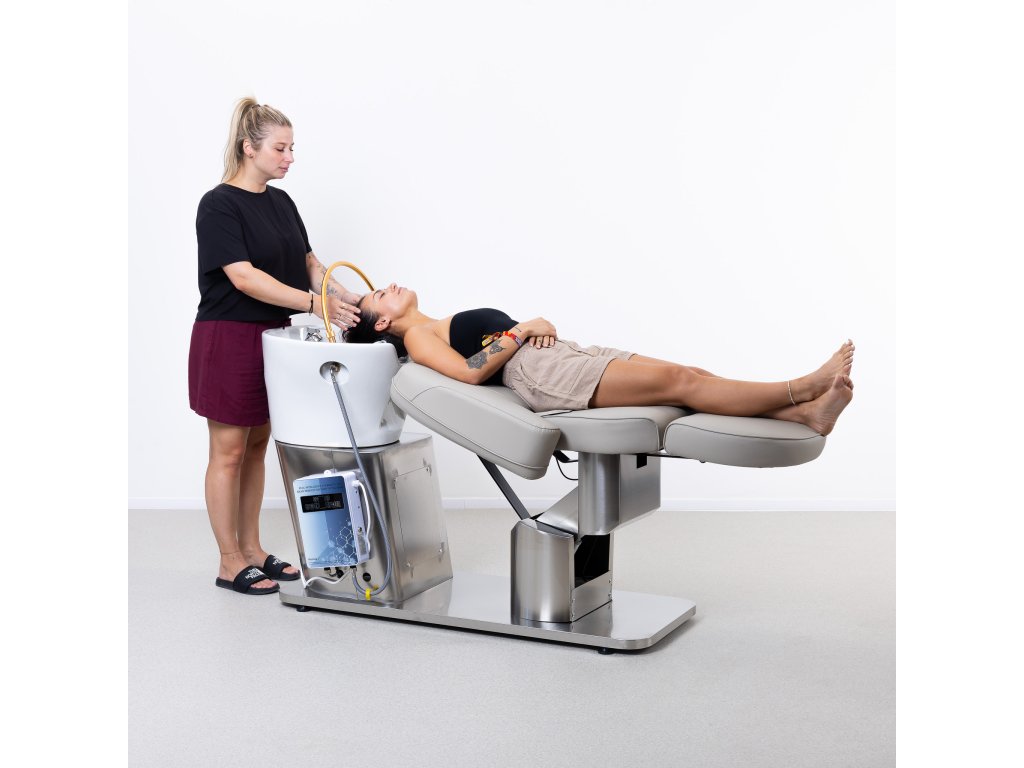 A készülék vízáramoltató rendszere finom masszázst nyújt, amely elősegíti a sampon és hajkezelő szerek alapos eltávolítását. Az automatikus vízmelegítő rendszer lehetővé teszi a víz hőmérsékletének beállítását 30 °C és 50 °C között – ez garantálja a maximális komfortot minden Head Spa kezelés közben. A gőzfunkció ellazítja a fejbőrt, javítja a vérkeringést, míg a hétféle színű fényterápia a relaxációt és a bőr fertőtlenítését támogatja.