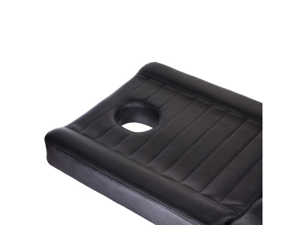 A párnák magas minőségű, rugalmas habbal töltöttek, ami hosszú távon is megőrzi kényelmüket. A fekete színű, kiváló minőségű ökobőr borítás nemcsak elegáns, de könnyen tisztítható, ami elengedhetetlen egy professzionális tetoválószalonban. A masszív váz és a maximális 100 kg-os teherbírás megbízhatóságot és stabilitást garantál.