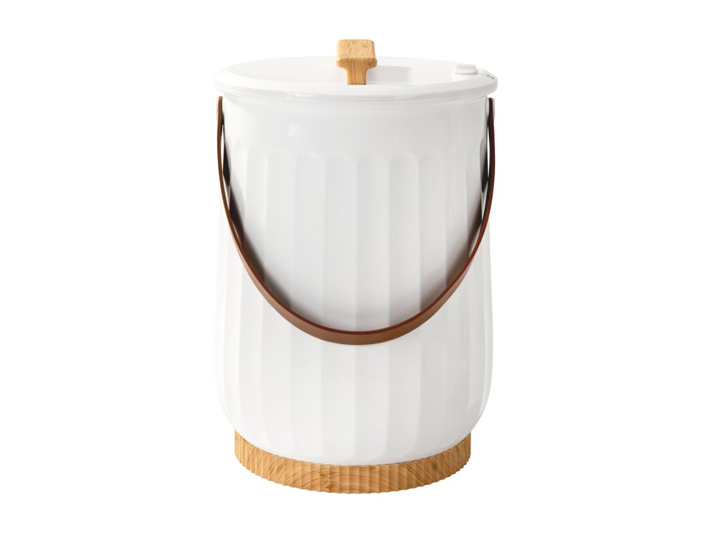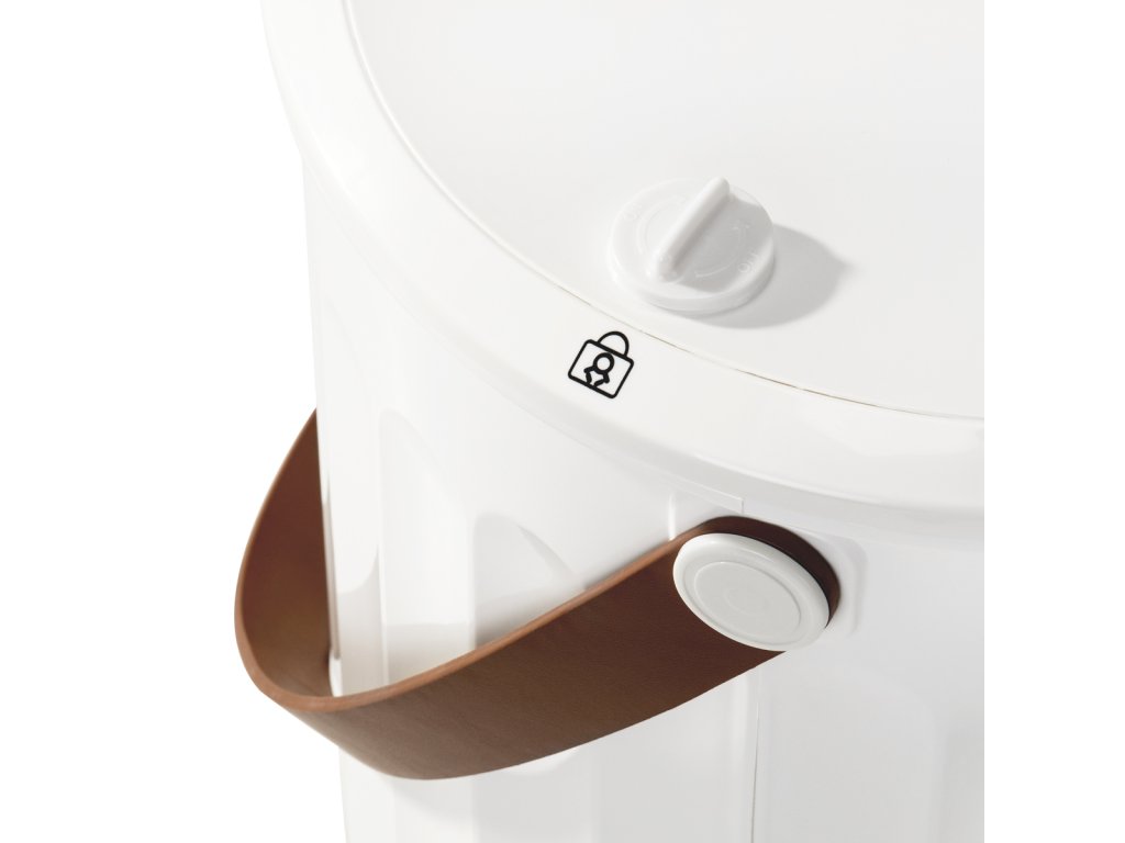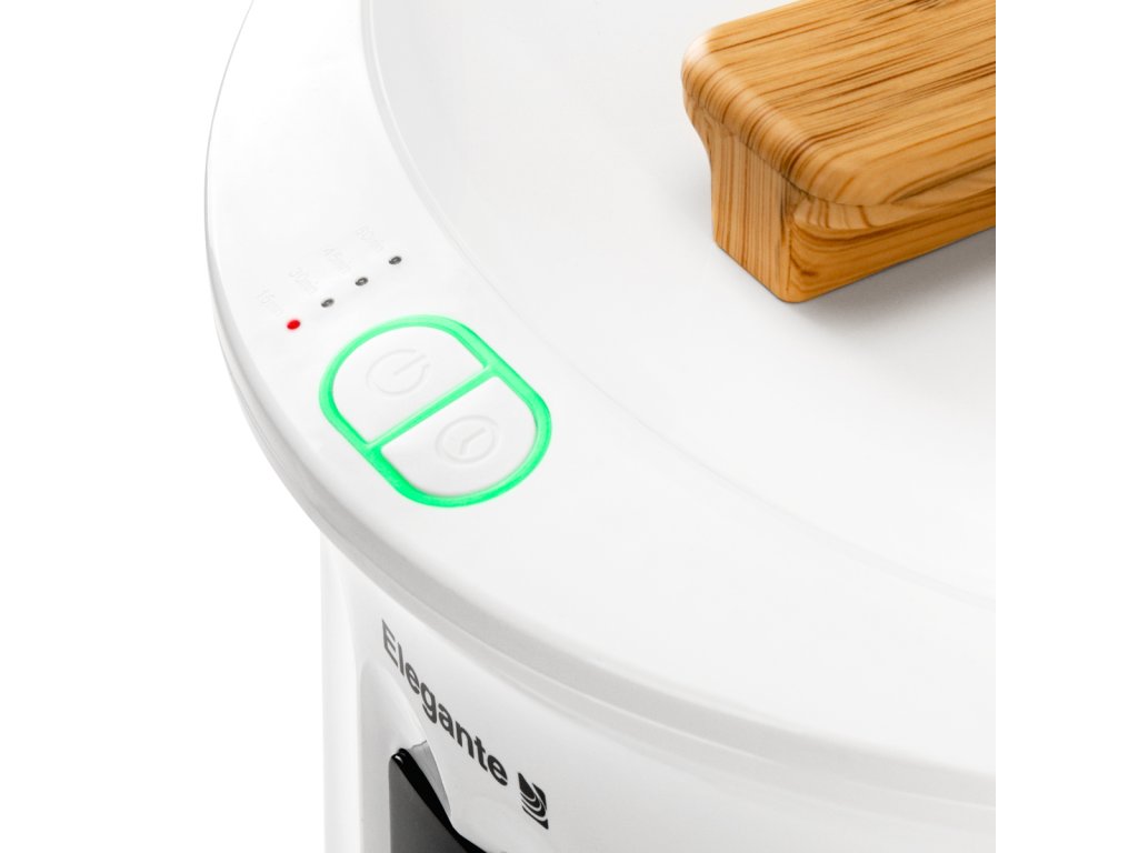 A fehér műanyag burkolat könnyen tisztítható, míg a barázdált mintázat és a faimitációs díszítőelemek elegáns megjelenést kölcsönöznek. A gombok körüli LED-jelzőfények tájékoztatják a működési állapotról, a választott üzemidőről. A hordozószíjjal könnyen mozgatható és tárolható, míg a stílusos kerek talp helyet takarít meg.