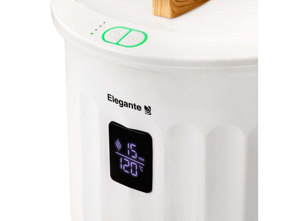 A Gyors felmelegítés funkcióval rendelkező Elegante E18 törölközőmelegítő pillanatok alatt használatra kész. Az időzítő funkcióval (15, 30, 45 vagy 60 perc) egyszerűen beállítható a működési idő, amely után a fűtés automatikusan leáll. A kijelző visszaszámolja a hátralévő időt és mutatja a belső hőmérsékletet. Az automatikus kikapcsolás segít energiát takarítani, míg a beépített aromaterápiás korongtartó kellemes illatot ad a felmelegített törölközőknek.